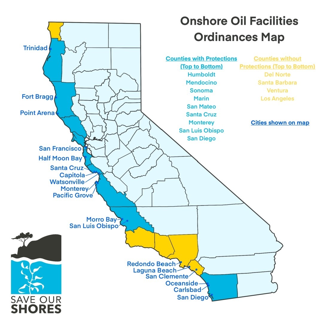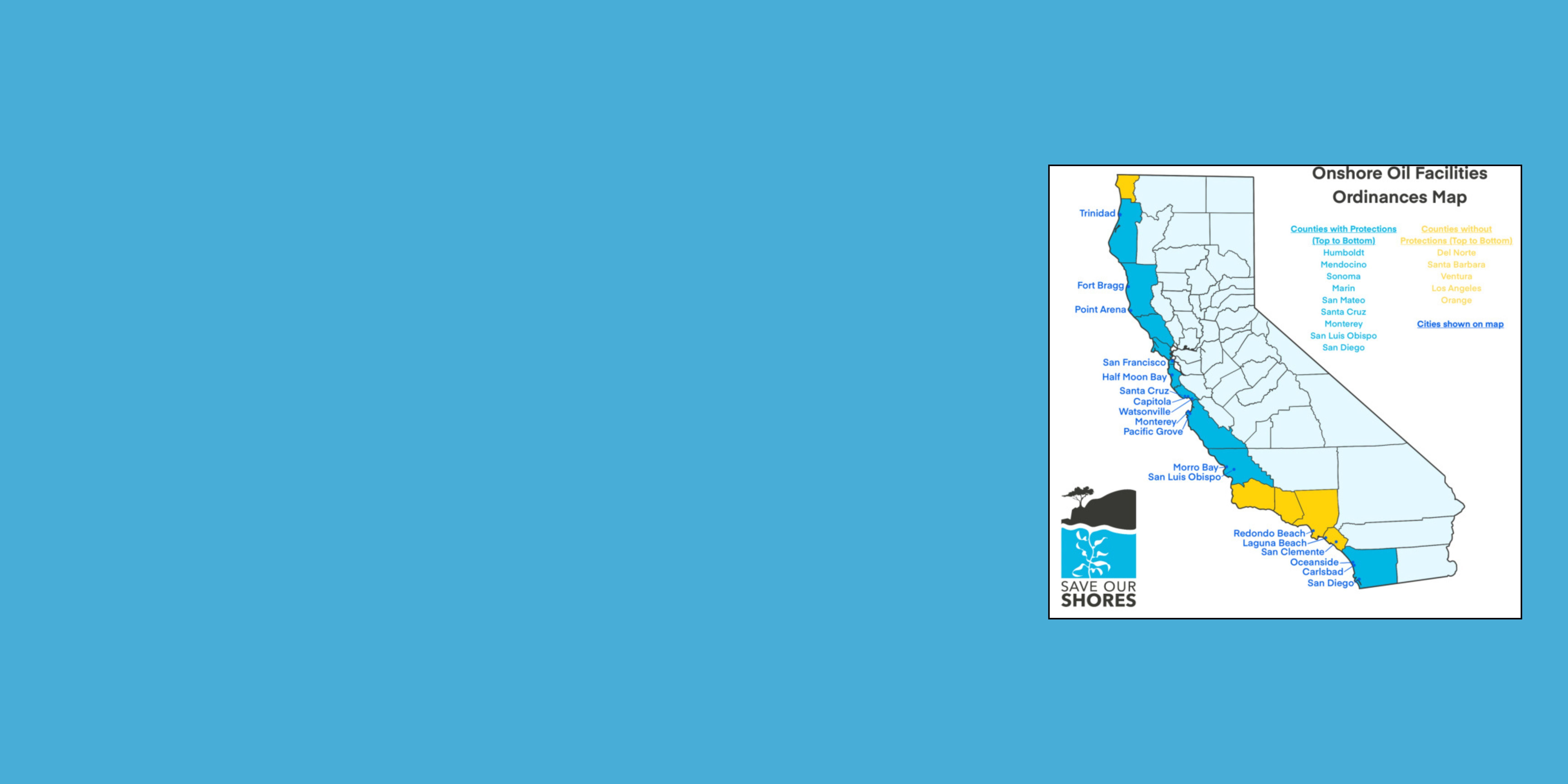 The Blue Wall is a group of local laws passed by coastal cities and counties across California. These laws stop or limit onshore facilities that support offshore oil drilling.